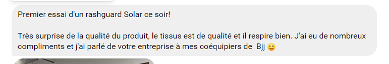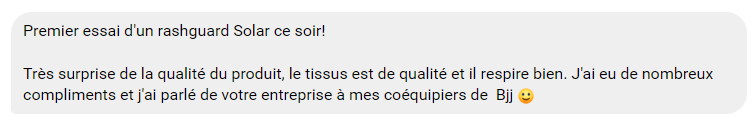 "Très surprise de la qualité du produit, le tissu est de qualité et il respire bien. J'ai eu de nombreux compliments et j'ai parlé de votre entreprise à mes coéquipiers de BJJ"